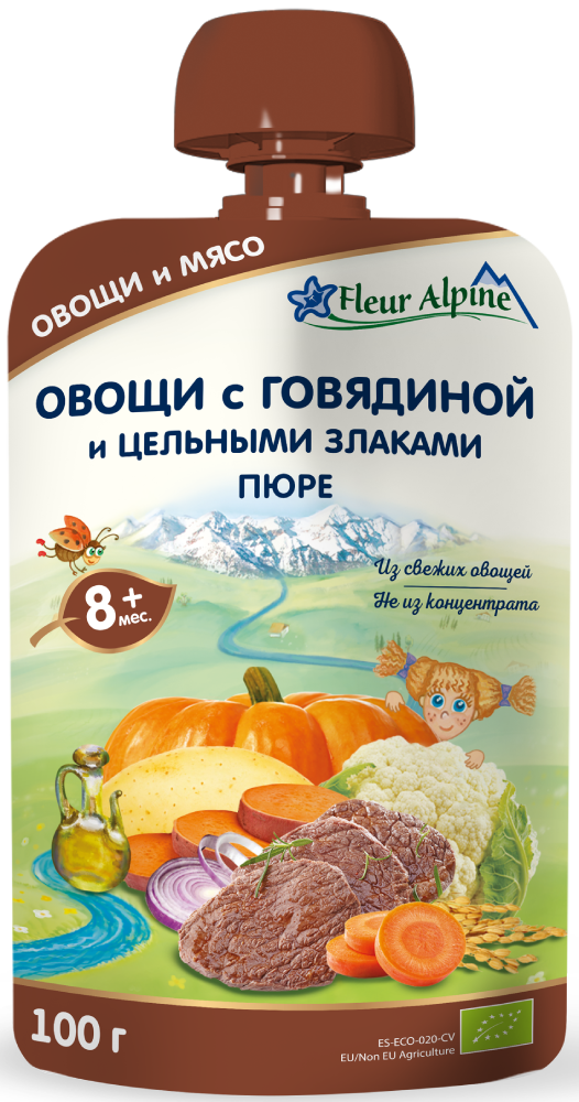 овощи* (цукини*, тыква*, зеленый горошек*, картофель*, лук-порей*), вода, телятина*, цельнозерновая рисовая мука*, оливковое масло первого холодного отжима*